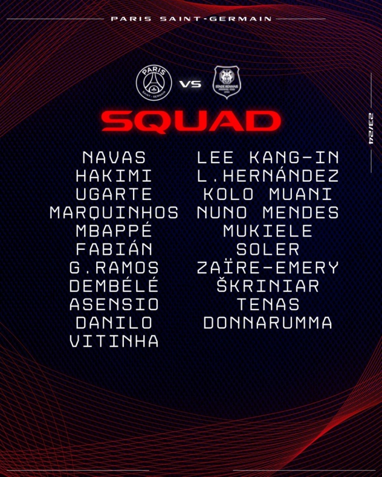 巴黎對陣雷恩的大名單: