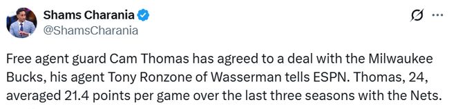 此前,名記Fischer就報道,盡管籃網此前收到過關于托馬斯的交易報價,但雄鹿是唯一一支真正對他有實質興趣的球隊。如今托馬斯成為自由球員,雄鹿簽下也是順理成章。
