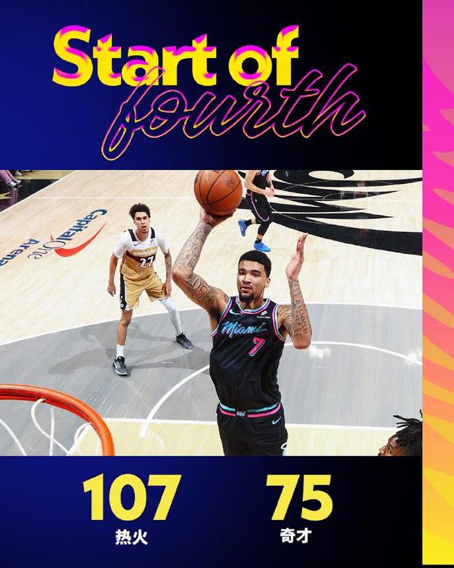 中場休息回來,熱火連續三節單節得分30+,且限制奇才連續兩節單節不超過25分。熱火依然是進攻火力碾壓,鮑威爾三節5記三分21分與阿德巴約22+7,引領熱火已經多達5人得分上雙,熱火三分36中18高達5成準星。奇才被限制三分29中9,全隊3人得分上雙,但最高分僅13分,熱火單節33-23凈勝10分,三節結束熱火已經取得107-75領先奇才。
